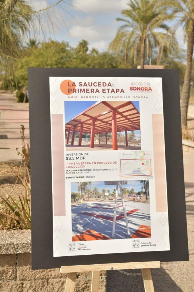 De igual forma, el Ejecutivo sonorense verificó los trabajos que se realizan en el proyecto de rehabilitación del parque La Sauceda, mismo que cuenta con una inversión de siete millones 298 mil 123 pesos, en una primera etapa, consistente en la rehabilitación de áreas de sombreado, mobiliario urbano, edificio para servicios sanitarios, entre otras mejoras.