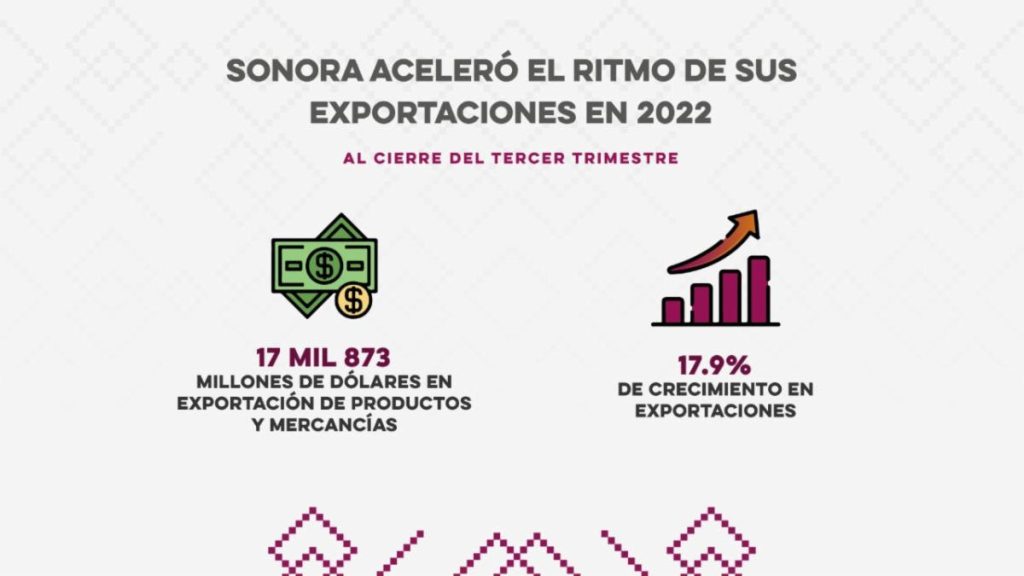 “Según el Inegi, Sonora aceleró el ritmo de sus exportaciones en 2022 y reporta que, al cierre del tercer trimestre, la entidad sumó 17 mil 873 millones de dólares en exportación de productos y mercancías, representando un alza del 17.9 por ciento”, destacó el mandatario.