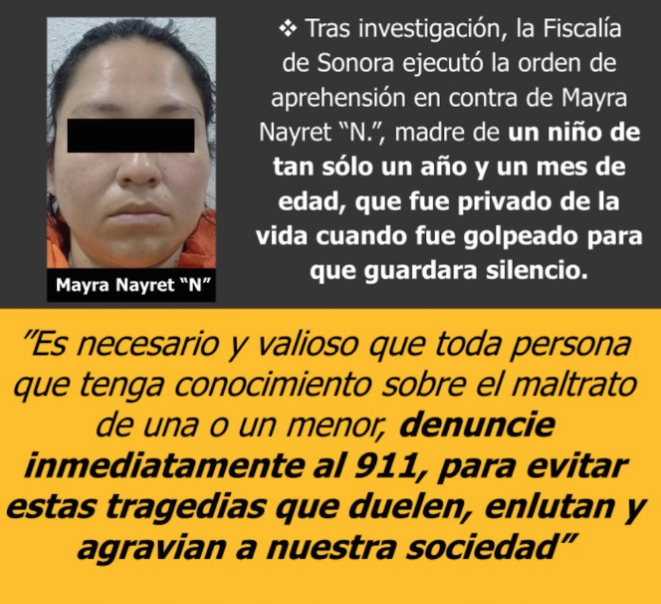 La Fiscalía de Sonora ejecutó la orden de aprehensión en contra de Mayra Nayret “N.”, madre de un niño de tan sólo un año y un mes de edad, que fue privado de la vida cuando fue golpeado para que guardara silencio.