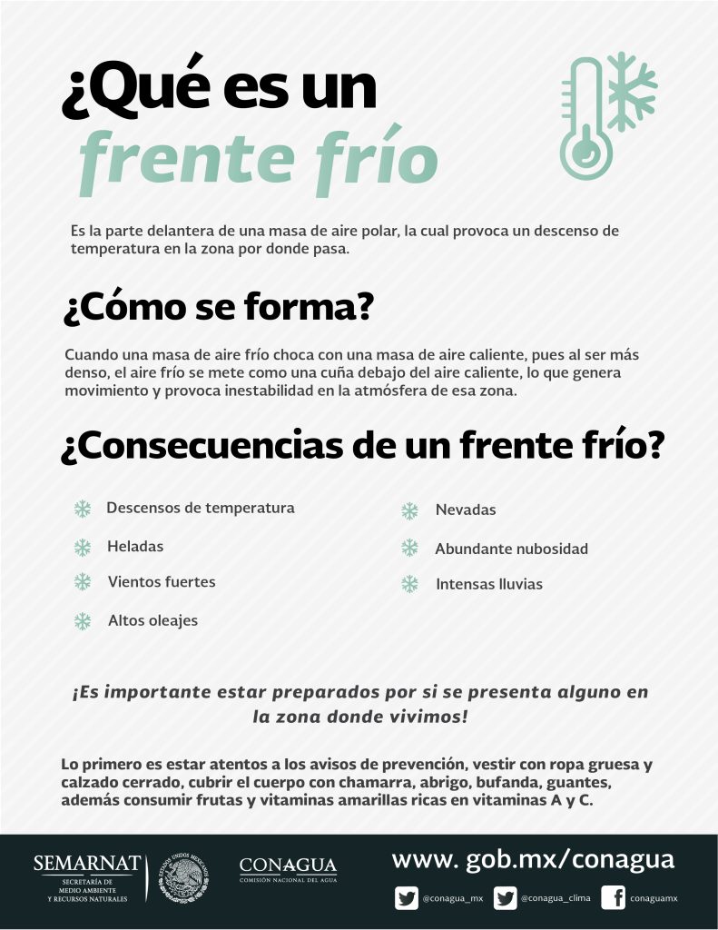 Los frentes fríos que afectan a nuestro país, se originan cerca del polo norte. Después de atravesar los Estados Unidos de América, cruzan el territorio nacional, del noroeste al sureste y según la época del año y su localización geográfica, pueden prolongarse de tres a siete días.