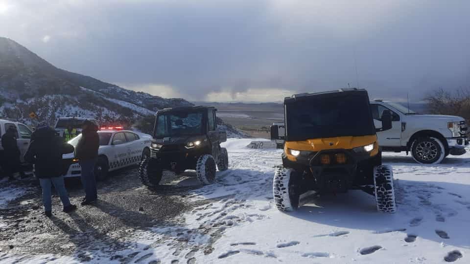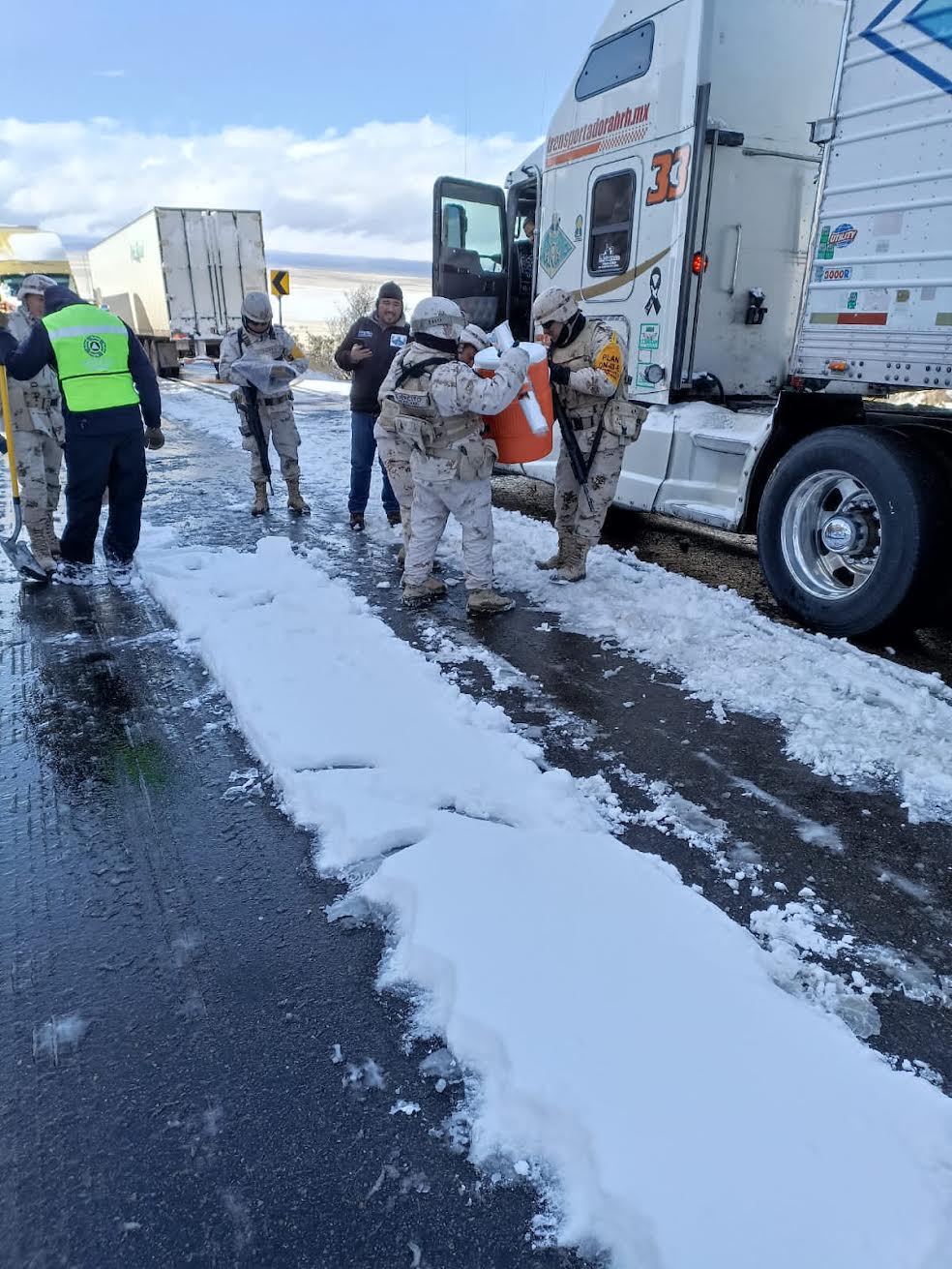 60 personas varadas en el Puerto San Luis, frontera entre Sonora y Chihuahua, reciben alimentos y bebidas calientes de parte de personal de Sedena, Guardia Nacional y Protección Civil.