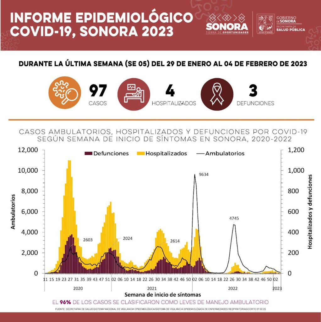 La Secretaría de Salud de Sonora confirma tres defunciones y 97 nuevos casos de Covid-19 durante la semana epidemiológica número cinco, que abarca del 29 de enero al 4 de febrero.