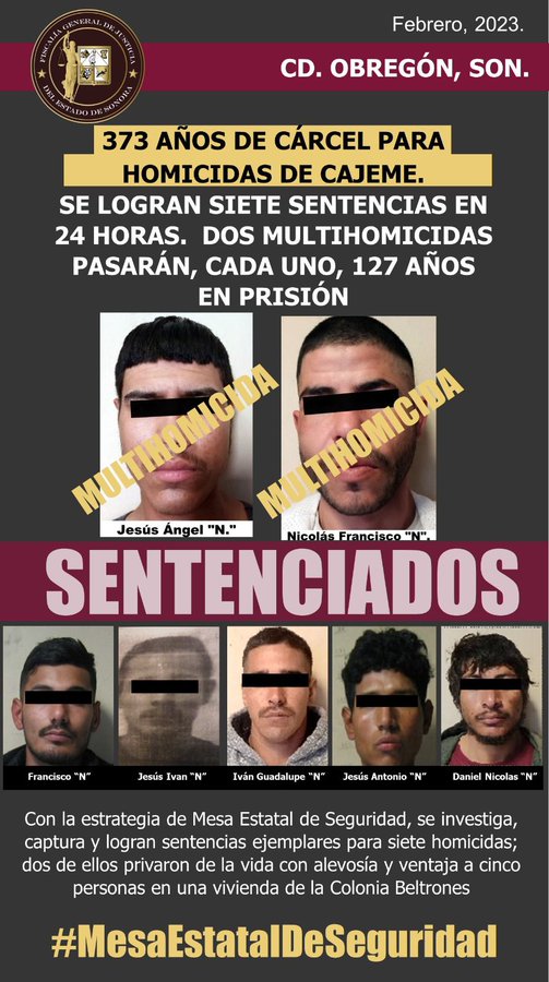 La Fiscalía General de Justicia del Estado de Sonora presentó contundentes pruebas para que Jueces dictaran 373 años de cárcel para siete homicidas en las últimas 24 horas, incluido un caso donde dos sujetos recibieron, cada uno, 127 años de cárcel.