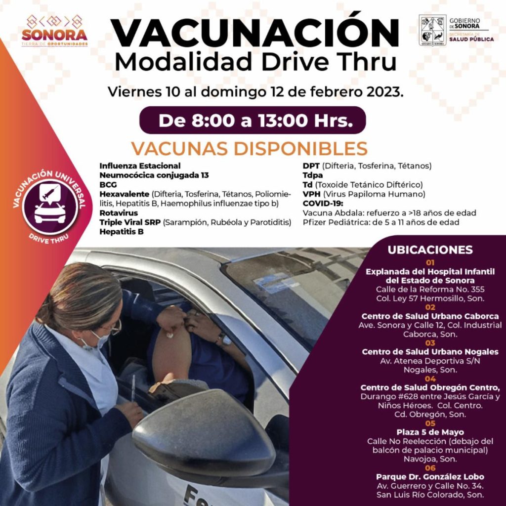 La Secretaría de Salud acercará servicios de vacunación general, en modalidad de servicio al auto o “drive thru”, en Hermosillo, Caborca, Navojoa, Ciudad Obregón, San Luis Río Colorado y Nogales.