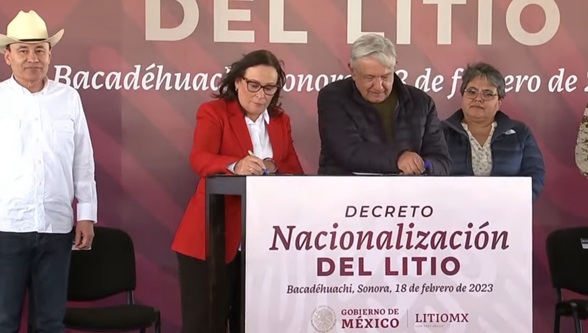 En el evento celebrado en el municipio de Bacadéuachi, donde se encuentra la reserva más grande de litio del país, el presidente Andrés Manuel López Obrador y la secretaria de energía Rocío Nale García, firmaron un acuerdo con el que se instruye a la SE a dar seguimiento a la Declaración de zona de Reserva Minera de Litio, tras el decreto de nacionalización de 234 mil 855 hectáreas de zona de reserva minera de litio en este municipio.