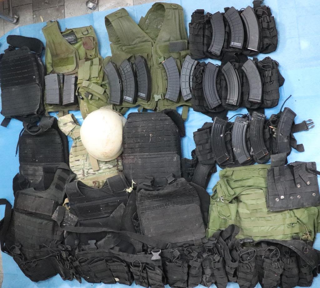 En ambos domicilios se recolectaron múltiples casquillos percutidos calibres 7.62×39, .223, 5.56 y 7.62×51, alrededor de dos chalecos porta-cargadores, siete chalecos con placas balísticas, un casco antibalas, cinco teléfonos celulares y dos cargadores para proyectiles de armas largas.