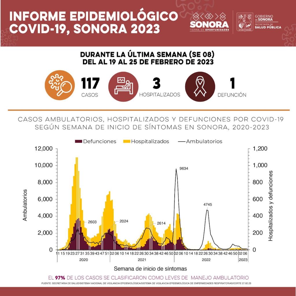 En esta última semana que abarca del 19 al 25 de febrero de este 2023, la institución de salud confirmó 117 nuevos casos de Covid-19 y una defunción a causa de la enfermedad, esto durante la semana epidemiológica (8), que abarca del 19 al 25 de febrero.