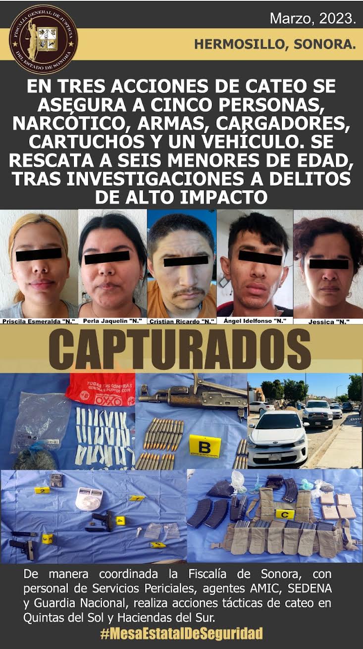 Tras cateos en tres domicilios en las colonias Hacienda del Sur y Quintas del Sol, agentes de la fiscalía de Sonora rescataron a seis personas menores de edad, femeninas de 15 y 1 años de edad y masculinos de 14, 12, 10 y 3 años.
