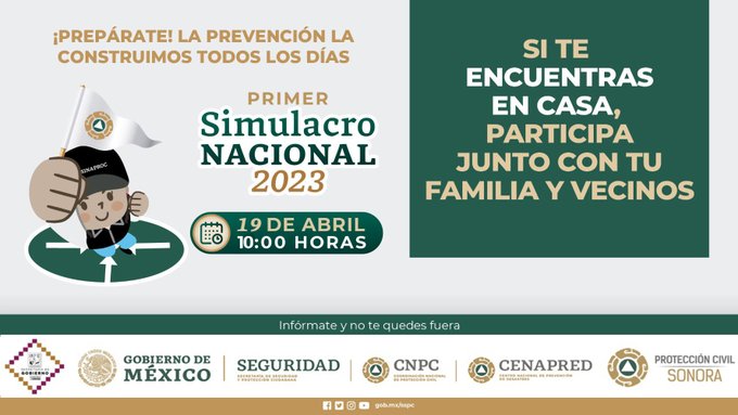 Indicó que la convocatoria destinada a instituciones públicas y privadas, contó con amplia respuesta tanto de autoridades federales, estatales, municipales, así como de empresas y particulares, para que se realice el simulacro en cientos de inmuebles a las 10:00 de la mañana hora local del próximo 19 de abril.
