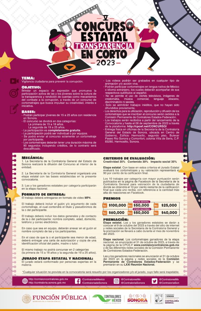 Con el objetivo de fomentar espacios de expresión sobre la cultura de la legalidad y vigilancia ciudadana, el Gobierno de Sonora, a través de la Secretaría de la Contraloría General, invitó a las y los jóvenes de la entidad a participar en el V Concurso Estatal Transparencia en Corto 2023, con el que podrán ganar hasta 100 mil pesos como premio.
