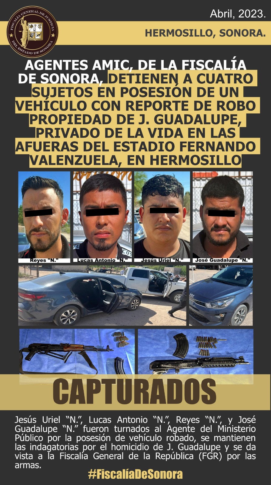 Agentes de la Fiscalía de Sonora capturaron a cuatro sujeto en posesión de un vehículo con reporte de reporte, propiedad de un masculino privado de la vida el pasado 19 de abril por fuera del estadio Fernando Valenzuela.