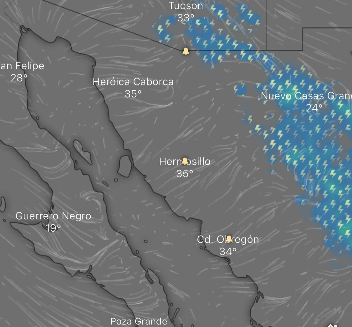 Se pronostican tormentas eléctricas con precipitaciones ligeras para esta tarde en el norte y sierra de Sonora, con especial atención en Agua Prieta, Naco, Santa Cruz, Cananea, Bavispe, Bacerac, Huachinera, Bacadéhuachi y Nacozari. Se recomienda extremar precauciones ante estas condiciones climáticas.