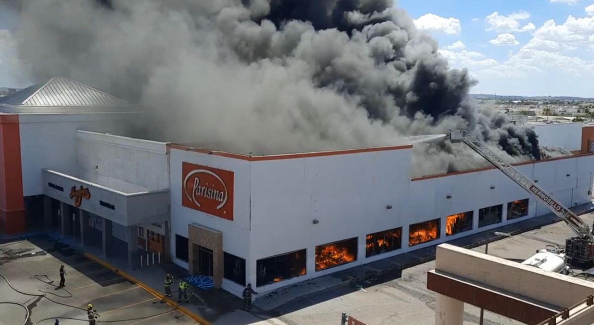 Personal de la Coordinación Estatal de Protección Civil Sonora trabaja con diversas dependencias de Gobierno para atender el incendio de una tienda de telas en un centro comercial en la esquina de Bulevar Encinas y Solidaridad en Hermosillo.