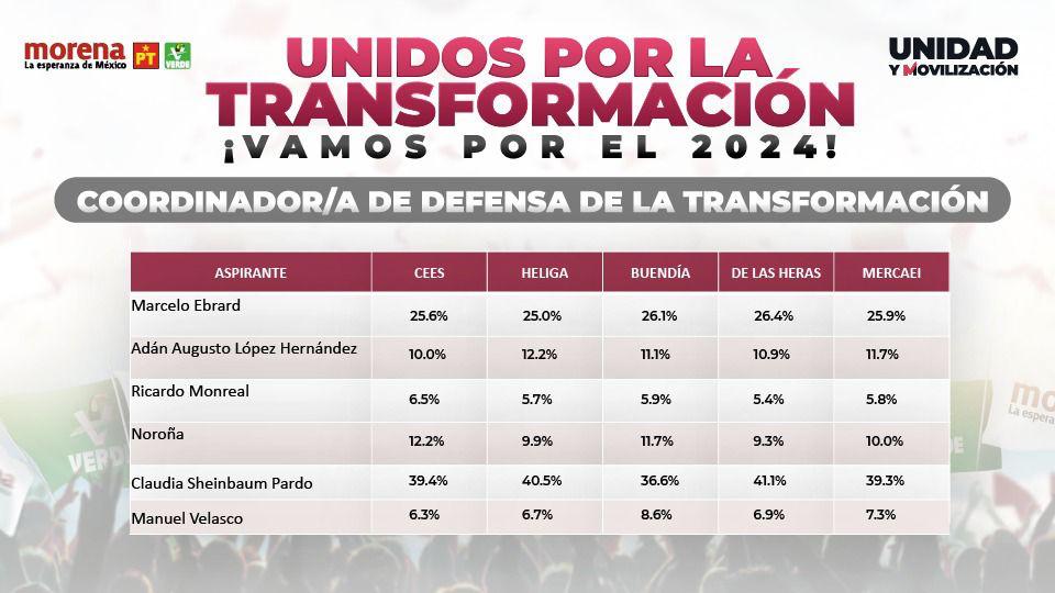 De acuerdo con los resultados de la encuesta Claudia Sheinbaum obtuvo 39.3 por ciento de las preferencias sumando las cinco encuestas. En segundo lugar Marcelo Ebrard con 25.6 por ciento, seguido de Gerardo Noroña con 12.2 por ciento, Adán Augusto López con 10 por ciento, Ricardo Monreal con 6.5 y Manuel Velasco con 6.3 por ciento. En todas las encuestas Claudia Sheinbaum resultó ganadora con amplia ventaja sobre el resto de los participantes de un universo de 12 mil 500 encuestados.