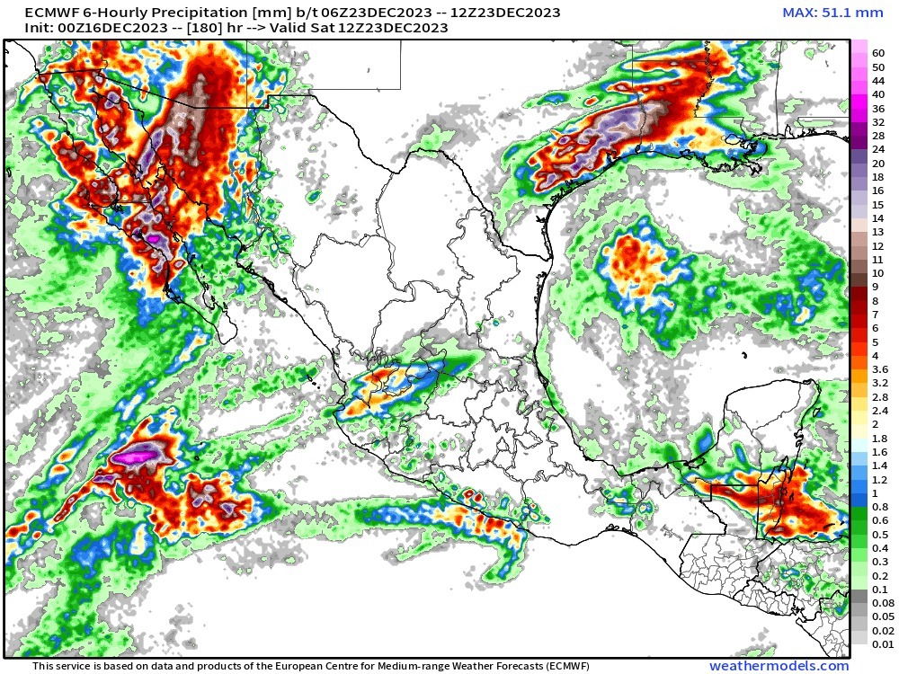 Por su parte, los efectos del monzón mexicano en interacción con divergencia ocasionarán tormentas eléctricas con lluvias ligeras a moderadas (5 a 25mm) y fuertes rachas de viento (+60 km/h) sobre el sur en horario vespertino.