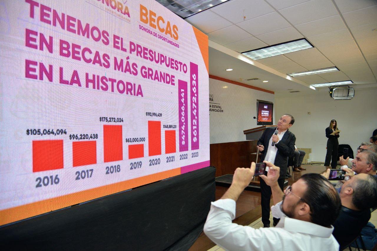 En 2022 el Gobierno de Sonora apoyó a 87 mil 600 estudiantes con becas, con una inversión de 475 millones de pesos. En 2023, el apoyo se extendió a 110 mil estudiantes, con una inversión de 612 millones de pesos. Para 2024, se espera beneficiar a 150 mil estudiantes, con una inversión de 740 millones de pesos.