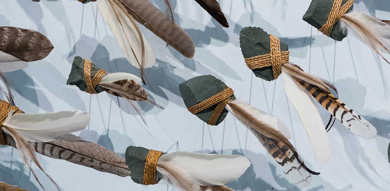 Una obra que sugiere un mapa dónde se intersectan las corrientes de vientos, evocando pájaros en vuelo y conocimiento, cambio y nuevas ideas circulando por encima de nuevas cabezas.