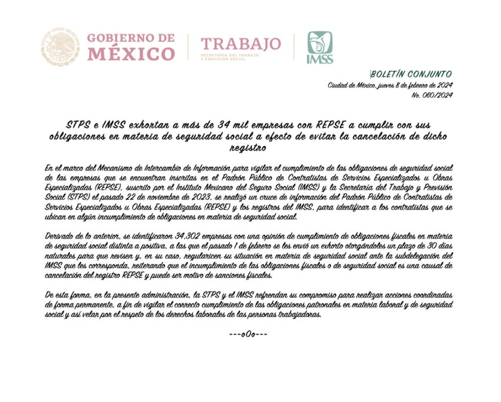 El 1 de febrero el IMSS envió un aviso a 34,302 empresas que no estaban cumpliendo con sus obligaciones de seguridad social. Estas empresas tienen 30 días para regularizar su situación.
