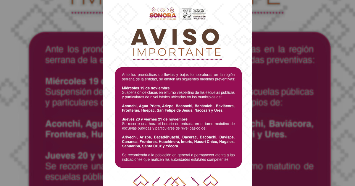 La Secretaría de Educación y Cultura (SEC) informa que se suspenden clases en el turno vespertino de las escuelas públicas y particulares de nivel básico ubicadas en los municipios de Aconchi, Agua Prieta, Arizpe, Bacoachi, Banámichi, Baviácora, Fronteras, Huépac, San Felipe de Jesús, Nacozari y Ures.