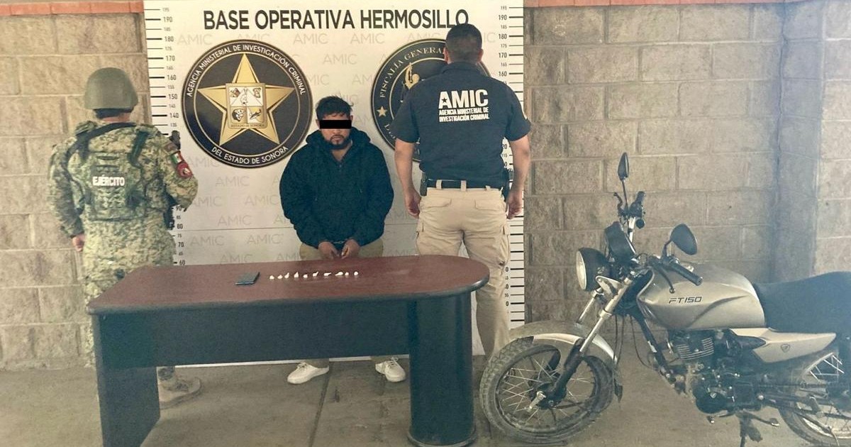 Durante estas labores, se detuvo a Gustavo Adolfo “N” en la colonia Nuevo Hermosillo, a quien se le aseguraron 10 envoltorios de sustancia granulada con características de cristal, una motocicleta y un teléfono celular, detectando además que este dispositivo estaba activo en grupos de mensajería utilizados para seguimiento, observación y vigilancia de las actividades operativas.