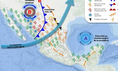 Durante el transcurso del dia de hoy un nuevo frente frío se aproximará al noroeste de México, se asociará con las corrientes en chorro polar y subtropical, originando vientos fuertes con rachas de 50 a 70 km/h y tolvaneras en Baja California, Sonora y Chihuahua.