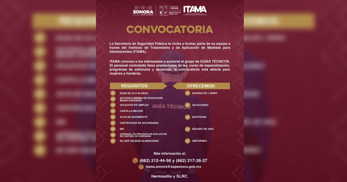 El Gobierno de Sonora convoca a mujeres y hombres para desempeñar funciones de seguridad como Guía Técnico al interior de los centros de internamiento del Instituto de Tratamiento y de Aplicación de Medidas para Adolescentes (ITAMA), localizados en Hermosillo y San Luis Río Colorado.