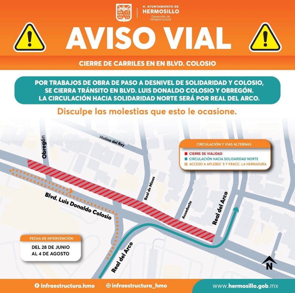 Como parte de las adecuaciones viales propias del proceso constructivo del paso a desnivel de Colosio y Solidaridad, a partir del próximo sábado 28 de junio se restringirá el flujo vehicular por la calle Obregón y se mantendrá como ruta alterna la calle Real del Arco para avanzar de sur a norte hacia el bulevar Navarrete y desde este retomar el bulevar Solidaridad hacia el norte, anunció Astarté Corro Ruiz.