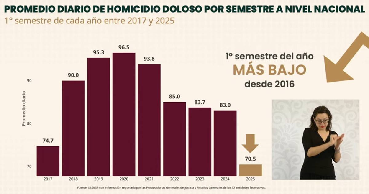 La incidencia de homicidios en el país registró una reducción del 24.5% durante junio de 2025, en comparación con septiembre de 2024, último mes de la administración anterior, informó Marcela Figueroa, titular del Secretariado Ejecutivo del Sistema Nacional de Seguridad Pública (SESNSP).