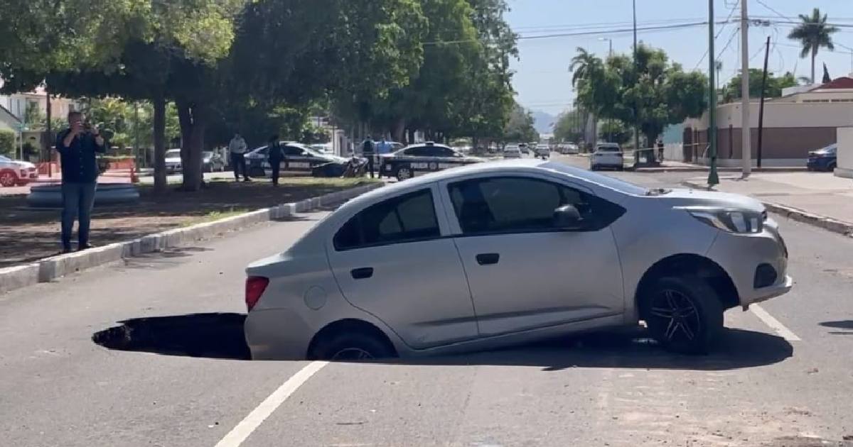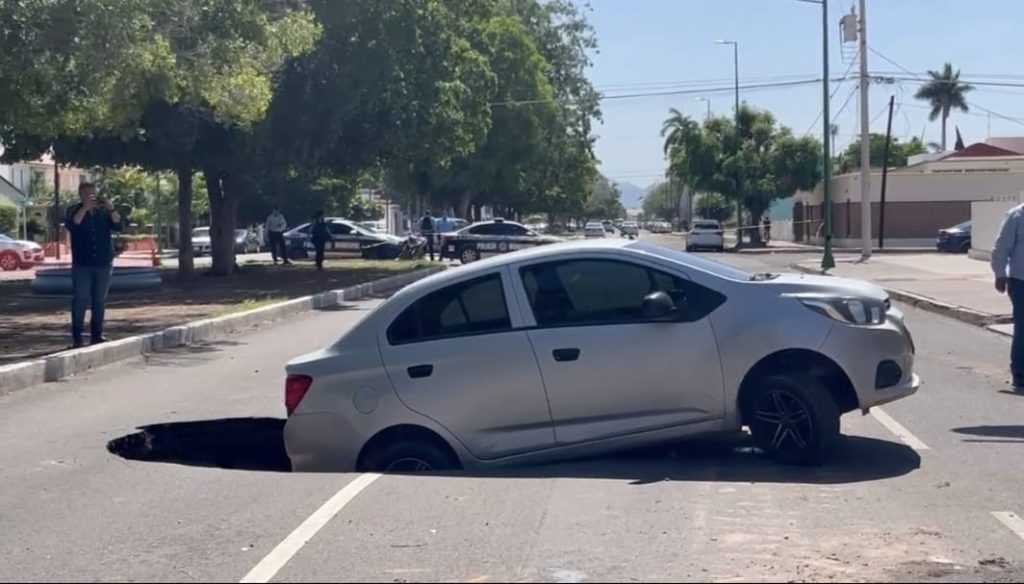 Un vehículo particular cayó en un socavón la mañana de este miércoles en la calle Náinari, entre Zacatecas y Puebla, en el centro de Ciudad Obregón, a pesar de que la zona se encontraba cerrada al tránsito y con señalética preventiva instalada por autoridades municipales.
