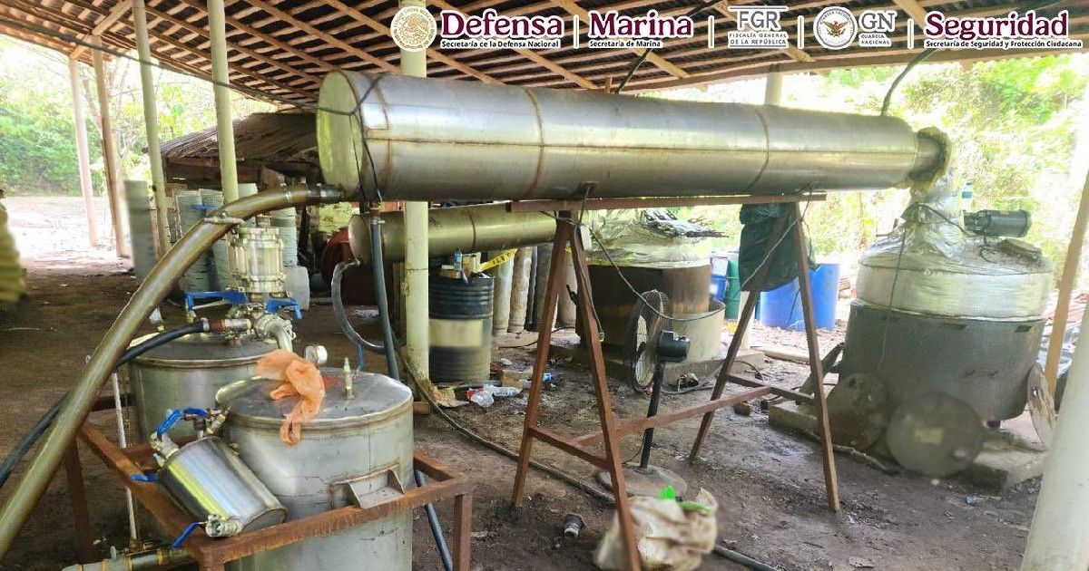 En el narcolaboratorio de Chiapas ubicado en un predio en la comunidad Margarita Maza de Juárez, aseguraron 2.5 toneladas de metanfetaminas, mientras que en una bodega del inmueble de la localidad Carachurio, municipio de Zirándaro en Guerrero; 4 toneladas y 7 mil litros de sustancias químicas.