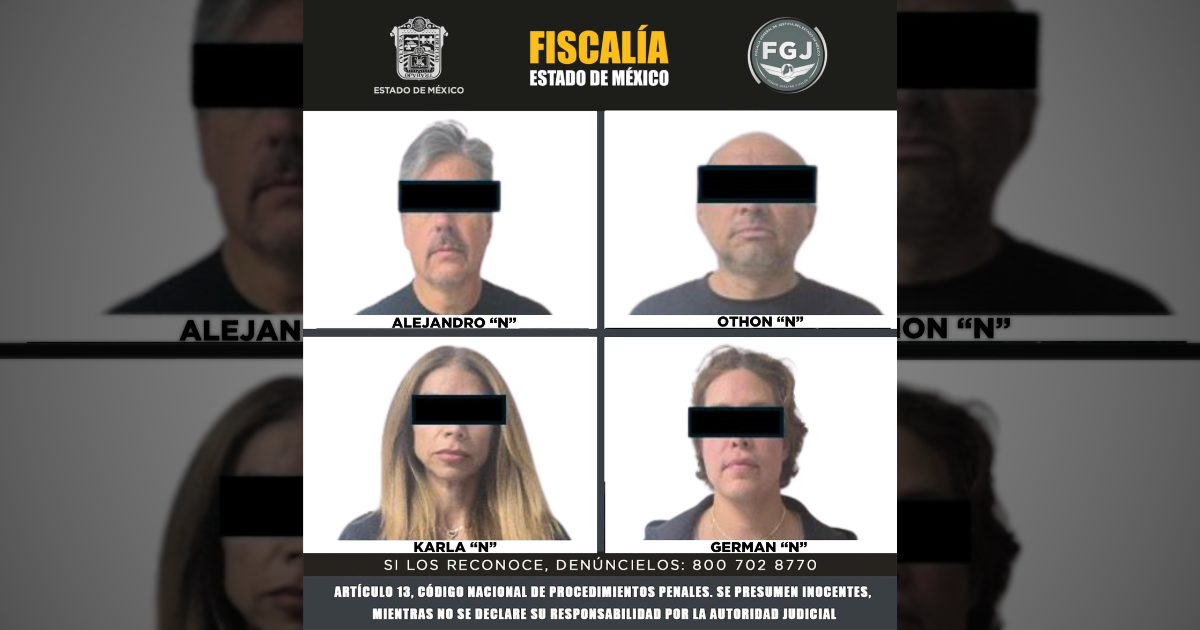La Fiscalía General de Justicia del Estado de México cumplimentó orden de aprehensión contra Alejandro German “N”, Othon “N”, Karla Alejandra “N” y Germán “N”, investigados por su probable intervención en el delito de homicidio calificado en grado de tentativa, en relación a los hechos registrados el pasado 19 de julio en un club de pádel, ubicado en el municipio de Atizapán De Zaragoza.