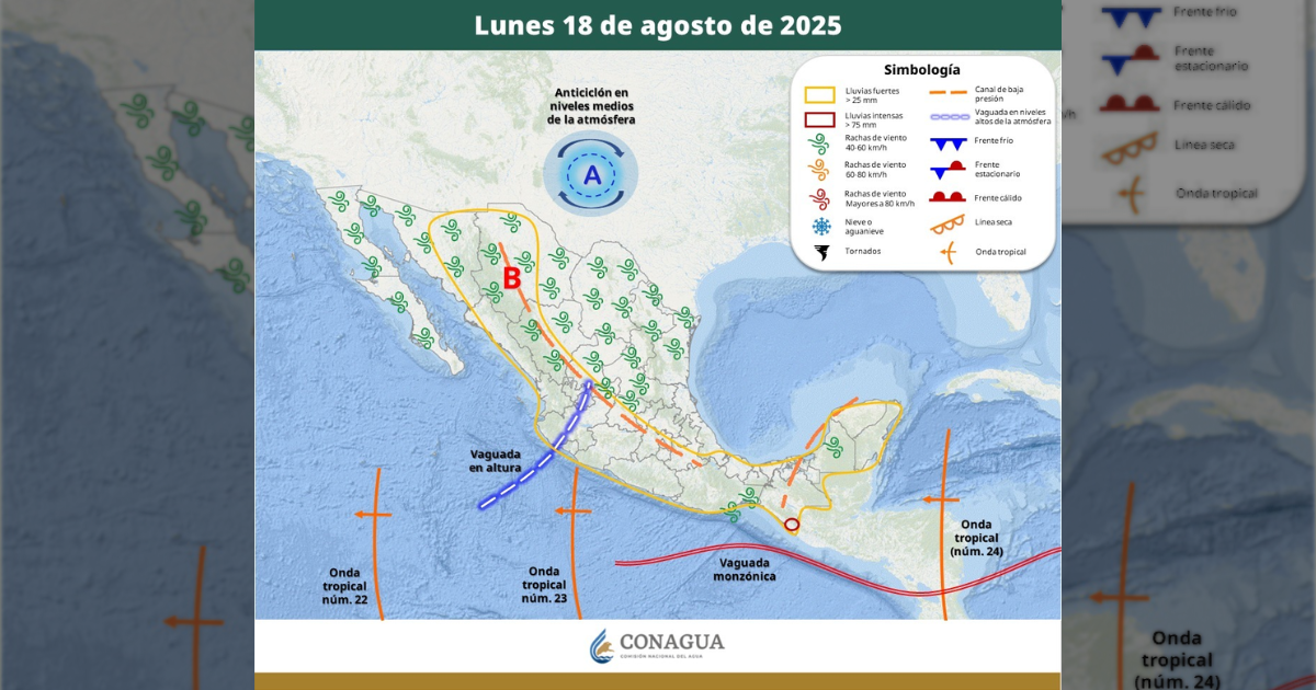 Los efectos del *monzón mexicano* en interacción con una circulación ciclónica en niveles medios de la atmósfera y divergencia ocasionarán tormentas eléctricas con lluvias ligeras a moderadas (20 a 75mm) y fuertes rachas de viento (+60 km/h) sobre el norte, centro, noreste, noroeste, este y sur en horario vespertino. A su vez, las bandas nubosas del sistema tropical “Mario” reforzarán la probabilidad de lluvia dentro del estado aumentando el flujo de humedad para ser aprovechado por el monzón.