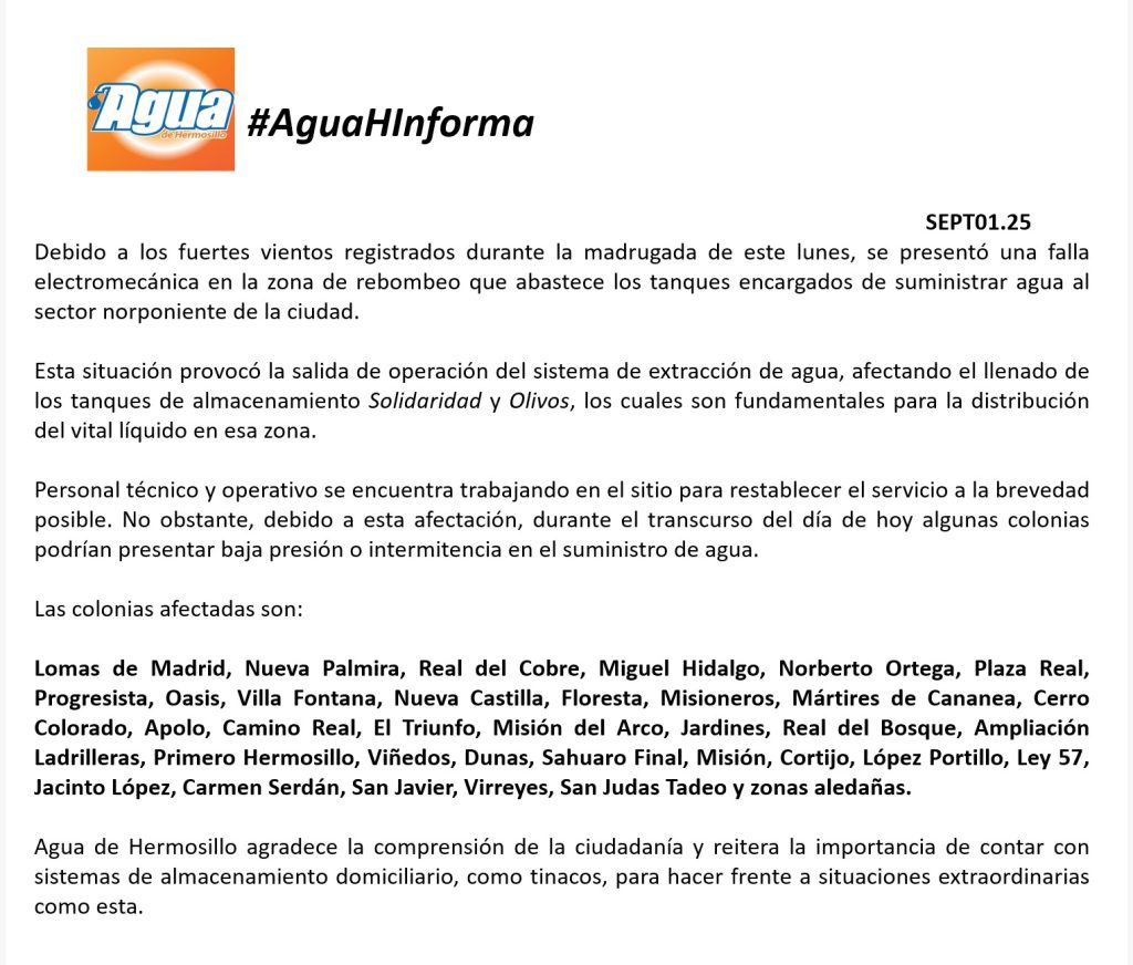 Mediante un comunicado de Agua de Hermosillo, debido a fuertes vientos registrados durante la madrugada de este lunes, se presentó una falla electromecánica en la zona de rebombeo que abastece los tanques encargados de suministrar agua al sector norponiente de la ciudad.