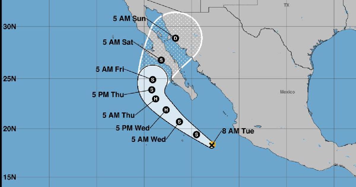 El sistema muestra un posible debilitamiento al cruzar la península de Baja California, con pronóstico de degradarse a depresión tropical durante el viernes en el Golfo de California.