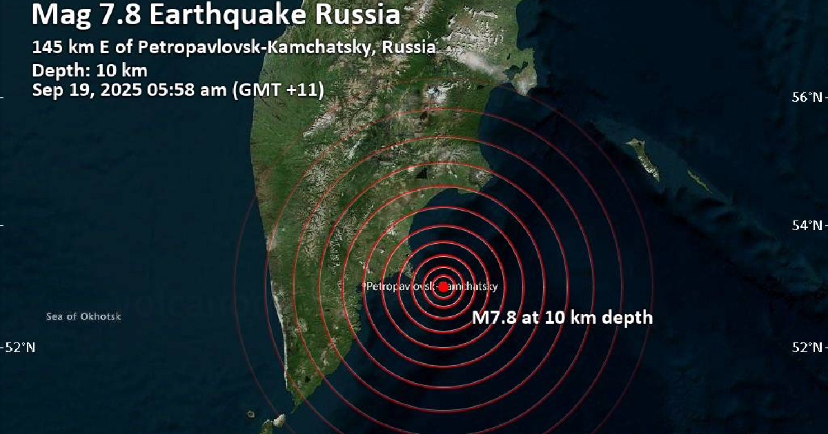 Un terremoto de magnitud 7.8 fue registrado 128 km al este de la ciudad de Petropavlovsk-Kamchatski, en Kamchatka, Rusia, a las 5:58 del 19 de septiembre, hora local.