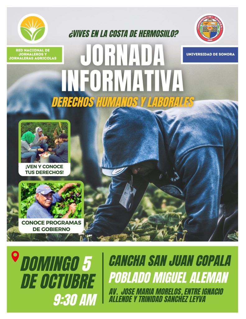 Con el objetivo de que jornaleros y jornaleras de la Costa de Hermosillo, Sonora, conozcan sus derechos laborales, la Red Nacional de Jornaleros y Jornaleras Agrícolas, a través del profesor investigador José Eduardo Calvario, con el respaldo institucional del Departamento de Sociología y Administración pública de la universidad de Sonora, invitan a la comunidad jornalera a formar parte de la jornada informativa que se llevará a cabo este próximo 5 de octubre en el Poblado Miguel Alemán.