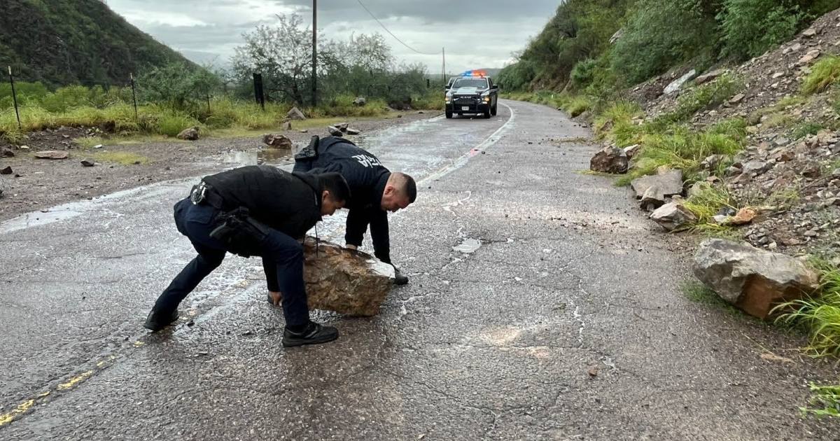 En caminos de la sierra de Sonora y Ruta del Río Sonora, la Policía Estatal mantiene patrullajes preventivos e identifican tramos afectados por deslaves para despejar las rutas, retirando las piedras que caen por las precipitaciones registradas en este sector.