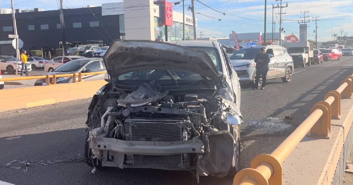 Un automovilista terminó impactado contra el muro de contención al intentar subir al puente desnivel ubicado en el cruce de los bulevares Solidaridad y Luis Encinas, generando un severo congestionamiento vial en la zona.