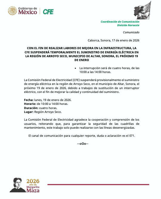 La Comisión Federal de Electricidad (CFE) informa a los residentes de la región de Arroyo Seco, en el municipio de Altar, sobre una suspensión temporal del suministro eléctrico programada para el próximo lunes 19 de enero de 2026.+2