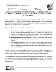 La Comisión Nacional del Agua (Conagua) emitió un llamado urgente a la población de los municipios de Cajeme, Navojoa y Benito Juárez, en Sonora, tras el derrame de una sustancia química en el Canal Alto, provocado por el accidente de un vehículo de carga