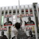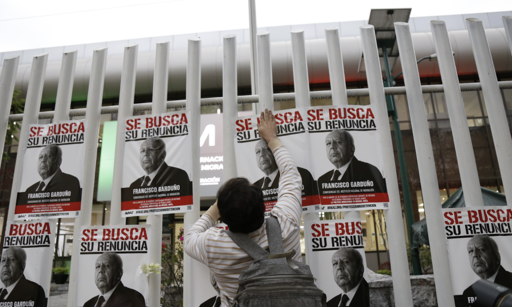 Activistas exigen con carteles la renuncia del director del Instituto Nacional de Migración (INM), Francisco Garduño, por la muerte de 40 migrantes en un incendio en...