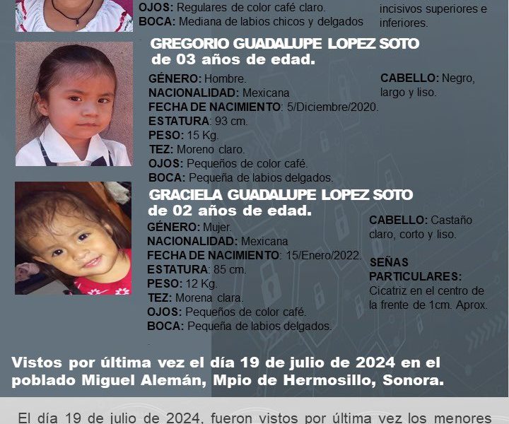 La Fiscalía General de Justicia del Estado de Sonora, exhorta a la comunidad a la difusión de datos de tres menores Grisel Guadalupe López Soto de...