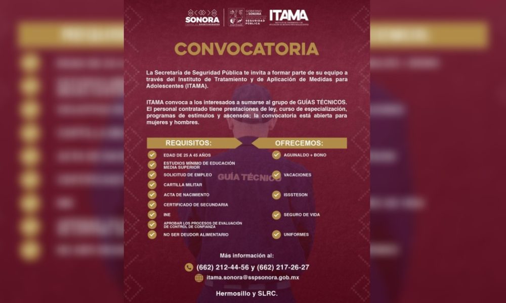 El Gobierno de Sonora convoca a mujeres y hombres para desempeñar funciones de seguridad como Guía Técnico al interior de los centros de internamiento del Instituto...