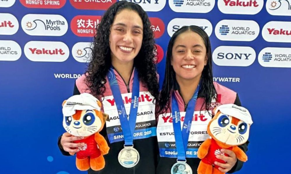 Ale Estudillo y Gaby Agúndez subieron al podio para tras ganarse una medalla de plata en el Mundial de Deportes Acuáticos Singapur 2025 con 304.80 pts.,...
