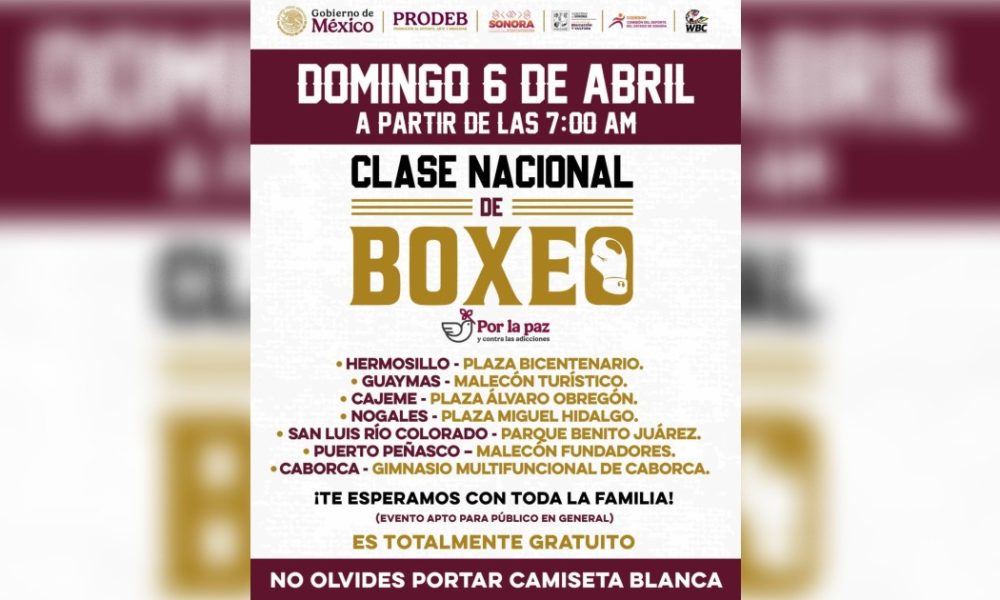 Sonora participará en la Clase Nacional de Boxeo, un evento masivo que se celebrará este domingo 6 de abril en diversas plazas públicas del país, como...