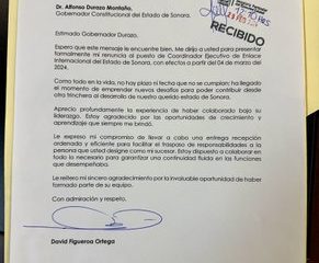El coordinador de enlace ejecutivo internacional del gobierno de Sonora, David Figueroa Ortega, informó que renuncia a su cargo con efecto a partir de este lunes...