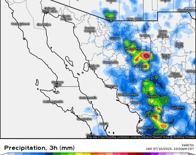 Se espera que estas precipitaciones alcancen niveles superiores a los 25 milímetros de lluvia acumulada en localidades como Ímuris, Nogales, Cucurpe, Arizpe, Banámichi, Cumpas, Moctezuma, Huasabas,...