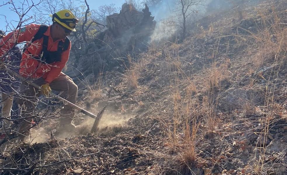 La Brigada Estatal de Manejo de Fuego junto a voluntarios y autoridades locales trabajan para controlar el incendio en Moctezuma, el cual inició el pasado 1...