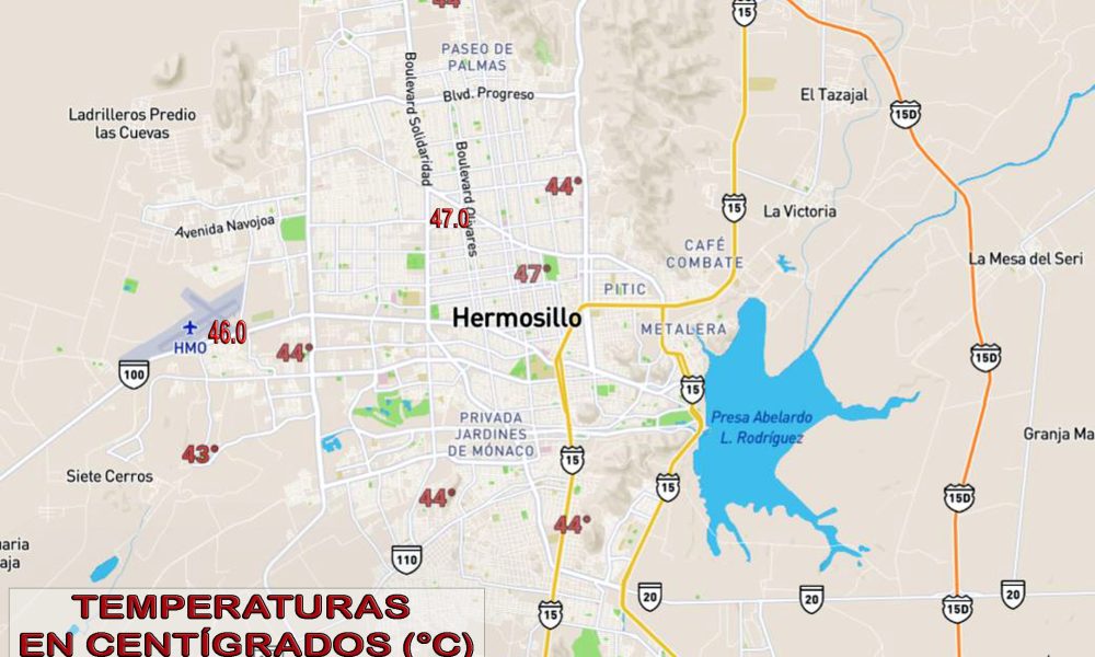 La tarde del 24 de junio de 2023, la Ciudad de Hermosillo alcanzó rangos de 44 a 47 grados Celsius, se insta a la población a...