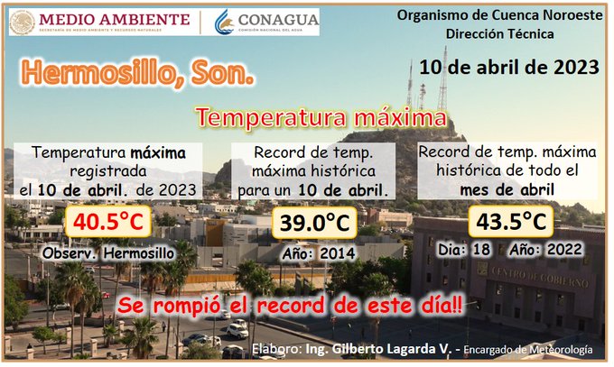 De acuerdo a la Comisión Nacional del Agua (Conagua) este lunes 10 de abril Hermosillo rompió el récord de temperatura máxima registrada en la ciudad para...